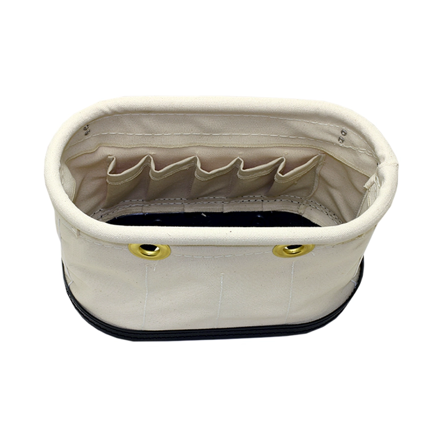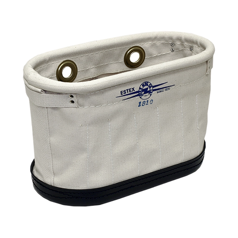 This oval shaped tool bag hangs on the aerial lift bucket with attachment hooks. There is a PVC ring in the top to shape the opening and PVC supports on the sides to keep the bag open. Seven hand tool pockets on the inside of the bag organize tools for easy access. Holes for attachment hooks are reinforced with brass grommets. The bag has a sturdy plastic bottom with drainage holes. If you don’t see the product you’re looking for, Estex can create it for you to your exact specifications.
