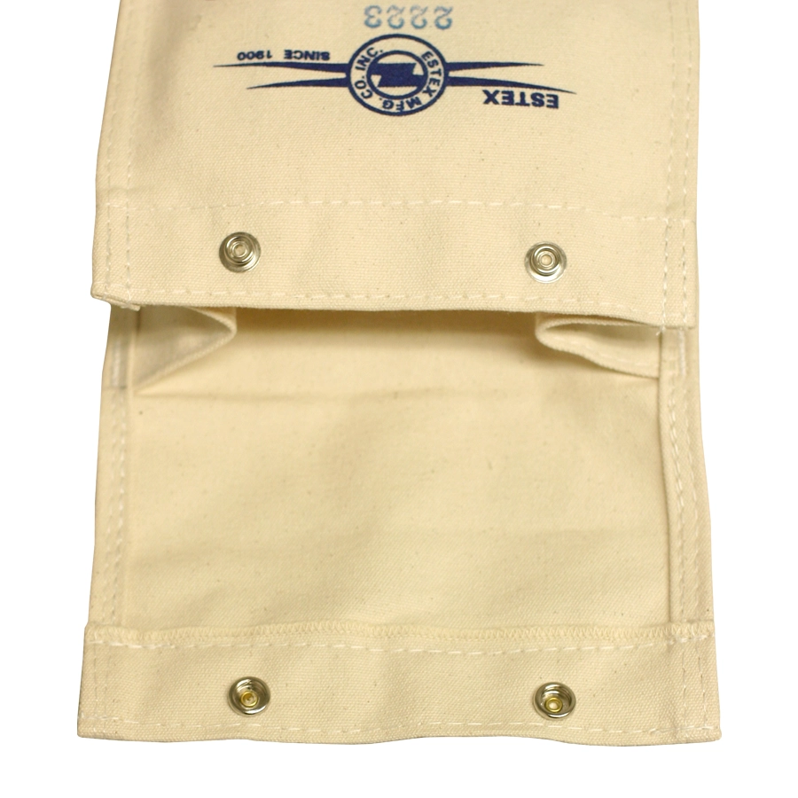 This bag is made from #10 canvas duck and is double stitched on all seams. There is a flap over the top with snap fasteners. On the back there is a quick release snap for attachment to belt which is reinforced inside and outside with leather. Both the snaps and quick release snap are nickel plated to prevent rust. The rivets are capped to prevent scratching of the rubber gloves. Grommets in the bottom provide drainage. Stress points have extra stitching for durability. If you don’t see the product you’re looking for, Estex can create it for you to your exact specifications.