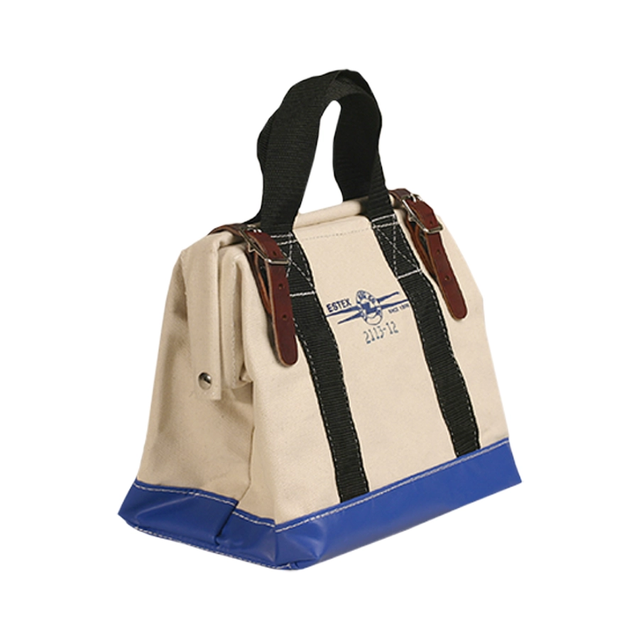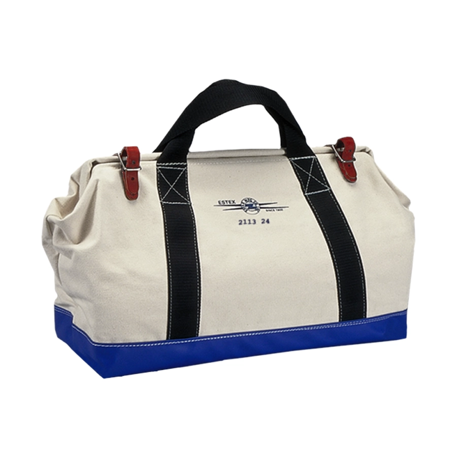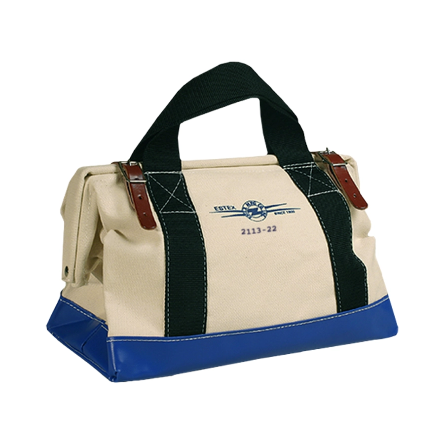 2113 series tool bags are constructed with heavyweight #4 canvas duck. The top opening has a steel frame to keep the bag open and provide security when closed. Two leather straps secure the opening. 2" web handles wrap around the entire bag for added strength. They have a "box X" stitch at the top for extra strength. The bottom is reinforced with heavy vinyl coated nylon and has a double tempered masonite board. Six brass studs are placed on the bottom of the bag to protect against abrasion. If you don’t see the product you’re looking for, Estex can create it for you to your exact specifications.