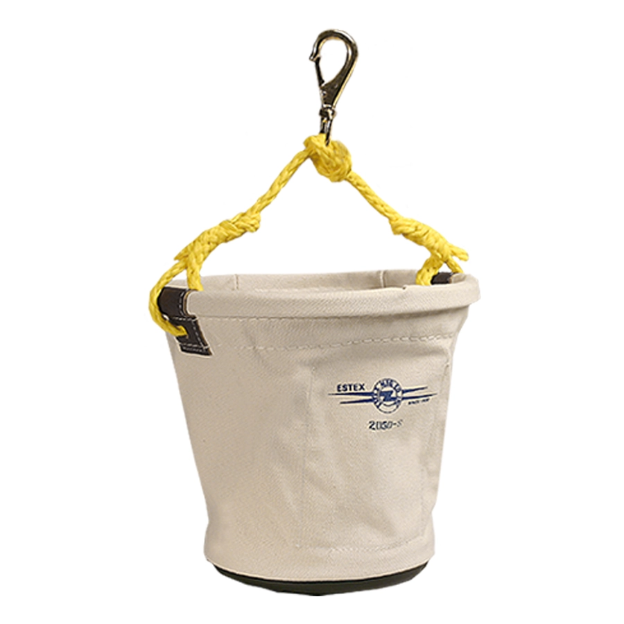 All Estex tool bucket are made of heavy duty canvas or vinyl coated nylon for long wear and use. The top ring is a single piece molded, non-metallic material designed to stay open even under severe and continuous load. The bottoms are made of high impact polymer resins or leather. The bag has leather side supports at the rope holes and a unique Estex feature whereby the bottom is stitched on and the body of the bag is folded back over the stitches to protect the threads from abrasion and excessive wear. This has the added benefit of providing a smooth padded area at the bucket bottom. Otherwise, your bucket becomes a rough sharp source of wear on the bucket truck and on the aerial bucket. The bucket also has Strong UV and rot resistant rope handle. If you don’t see the product you’re looking for, Estex can create it for you to your exact specifications.